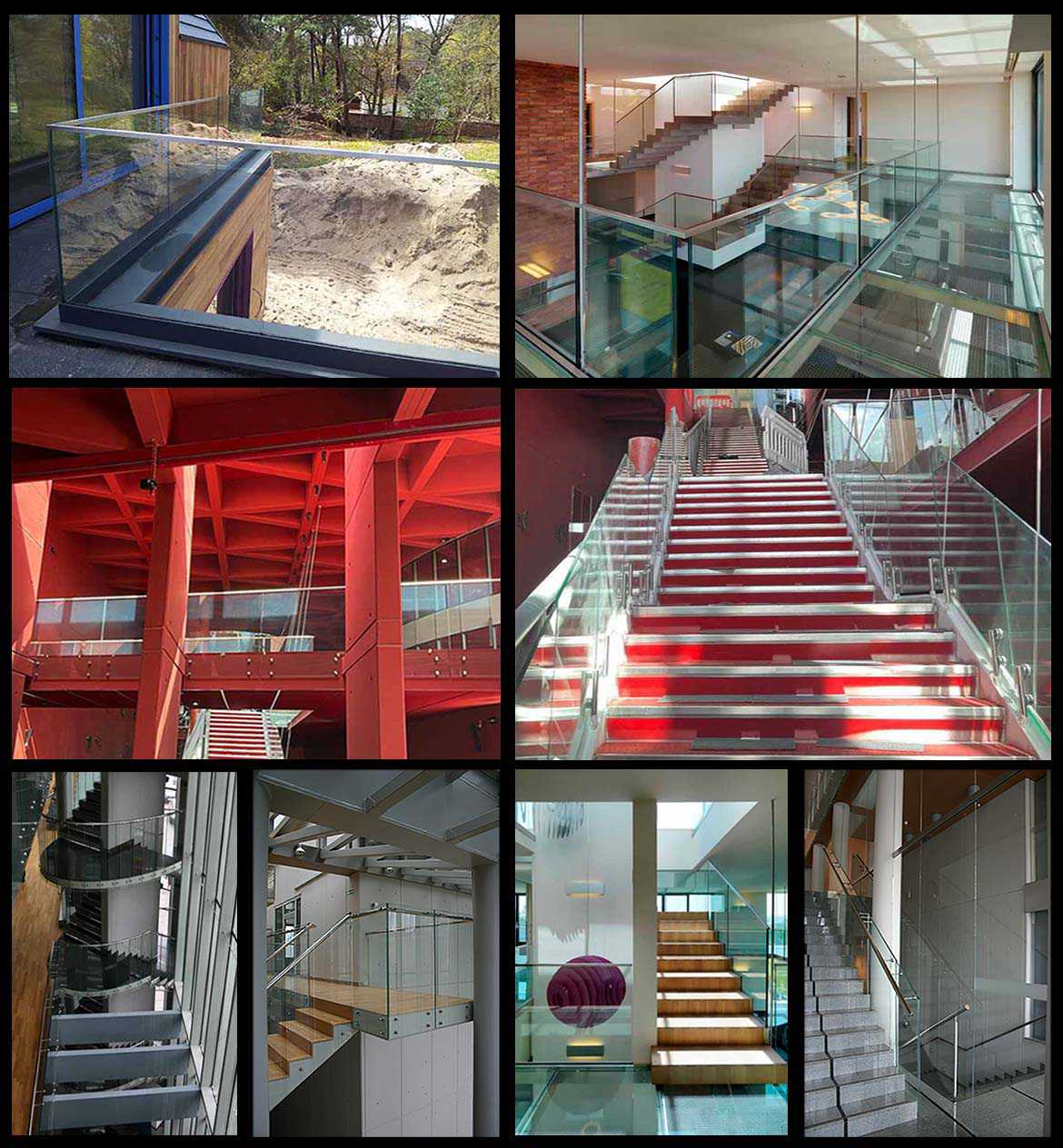 Räcken av självbärande glas tillsammans med annat material för ledstång, såsom stål, aluminium eller trä.