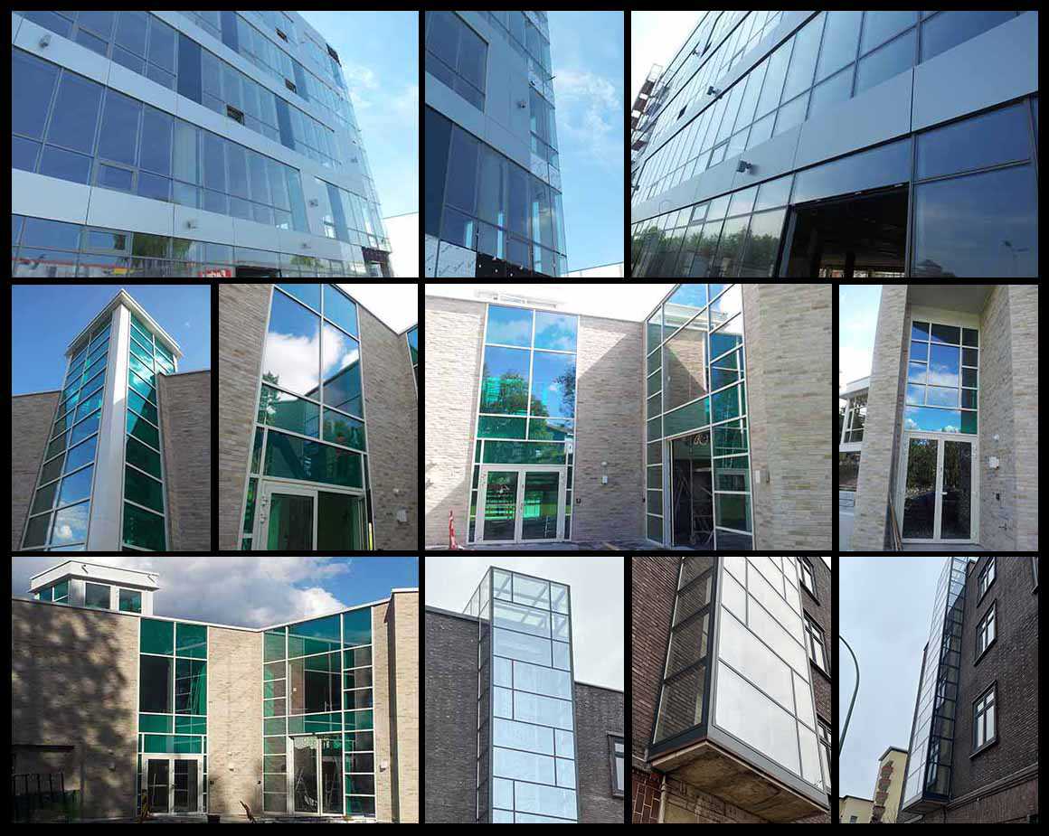 Glaspaneler monterade på stödstruktur i form av aluminiumramen, glasskivor fixeras med aluminium plåt, gummiband för isolering